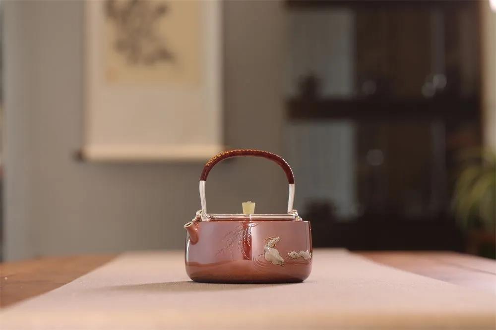 刻牛壺運(yùn)用銅包銀和金銀錯(cuò)技法。純銅自帶紅橙色金屬光澤,純銀無味,可凈化、軟化水質(zhì),泡茶可以提香,提升茶湯的品質(zhì)!