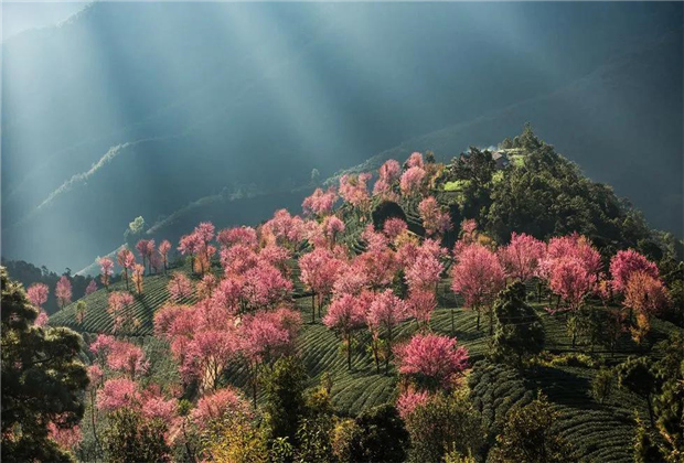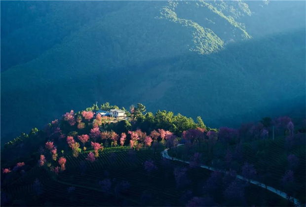 而這山也是極襯這花的。無量山雄奇又不失溫潤秀麗,絲絲縷縷的霧氣不時自山麓間飄來,綿延的茶樹在冬日依舊綠意盎然。千山一碧、云飄霧繞,無量山宛若一塊巨大的臺幕,盡心襯托著冬櫻的光芒四射。
