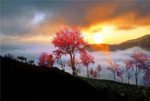 正值呵氣成霜的季節(jié),其它地方早已葉落歸根,滿目枯藤,可無量山櫻花谷中的冬櫻卻無視料峭寒風(fēng),開了個滿山櫻紅,遙遙望去,仿若霞光從天垂落,熠熠生輝。