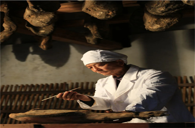 諾鄧火腿制作技藝主要包括選料、修割定形、晾干除水、排血、灑酒除菌、拍壓上鹽、腌制、上鹽泥、發(fā)酵、風(fēng)干等程序。