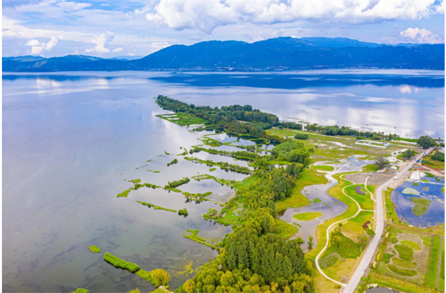從喜洲出發(fā),穿過蜿蜒的村道,10分鐘車程就可以到達(dá)洱海邊,在這里有個因形似舌頭而得名的濕地公園。