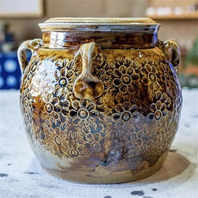 據(jù)說,起初土陶制品多為酒缸、水缸、米缸、發(fā)面盆、酸菜罐等日常生活用品,制式較為固定,花樣不多,有單、雙梅花和圈圈花等幾種,釉色基本為草木灰釉和醬釉。