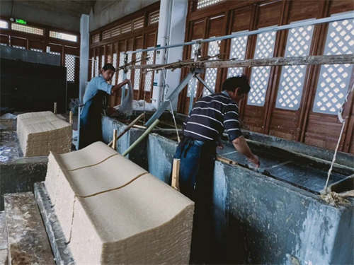 此外,白棉紙體驗作為鶴慶新華銀器小鎮(zhèn)的另一個新業(yè)態(tài),深受游客的喜愛。游客可以去鶴慶白族手工白棉紙傳承體驗中心體驗紙漿變紙張的神奇過程。撈紙師傅說:“傳統(tǒng)的白棉紙用的是構皮純手工制成,后來也有人添加過黃麻。撈紙漿的時候,越柔韌越好,技術好的師傅能把紙做得很均勻,很薄又不失韌性。等白棉紙制成以后主要是用于茶葉包裝、甲馬紙等。”摸著柔軟且有質感的白棉紙,你不得不被神奇的造紙技藝所折服。