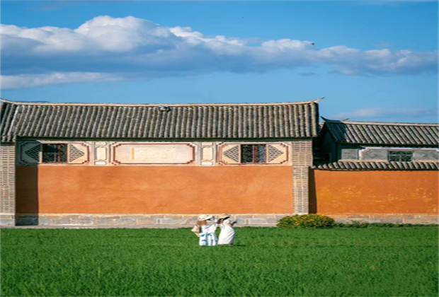 在古鎮(zhèn)的紅墻襯托下稻田顯得格外綠,
