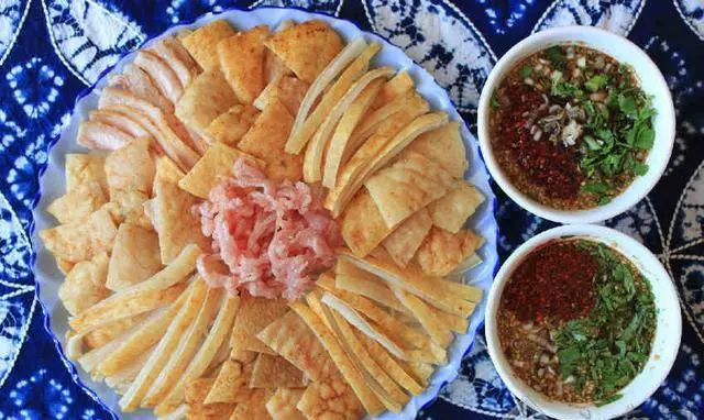 餌塊是由大米制成的薄餅,經(jīng)過(guò)烤制,變得香脆可口;燒好之后,可以加上辣醬、甜醬、芝麻醬、鹵豆腐、花生米末等調(diào)味,是大理著名的街頭小食之一。