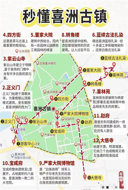 正義門--紫云寺--四方街--董家大院--藍(lán)續(xù)古法扎染--喜林苑--轉(zhuǎn)角樓--嚴(yán)家大院博物館--寶成府--趙府--大慈寺