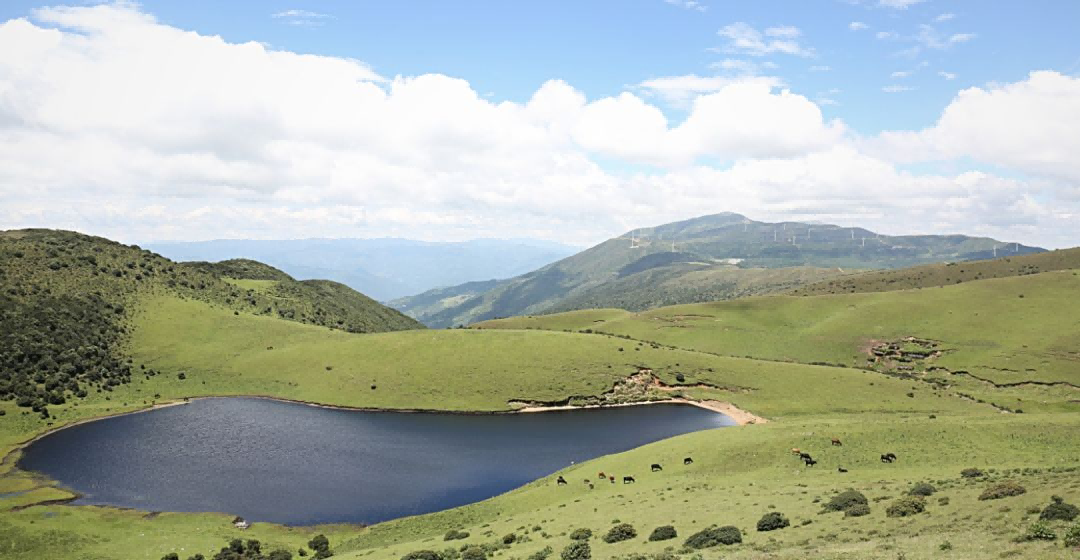 天鏡池與水滴池:天鏡池,位于東經(jīng)52.55,北緯25.57,海拔3529米,是鳳羽西南側(cè)最高山峰置于山顛的天然高山湖泊,成因不可考,可能是高原冰川湖泊。潭水分上下二潭,上潭稍大,呈長方形,長210-240米,寬130-160米,深1-2米許,近3萬平方米;潭內(nèi)水生植物豐富、水草茂盛,潭水清澈見底、蛙類眾多。下潭稍小,呈葫蘆型,長170米,寬35-110米,約1萬平方米,內(nèi)無水生植物與蛙類生存,潭口有上世紀(jì)五十年代修建的痕跡,下游濕地匯流成溪,是煉鐵鄉(xiāng)北邑河的主要水源地。整體來講,上下二潭是一個(gè)天然的高山濕地和草甸牧場,屬于瀾滄江水系黑惠江流域。