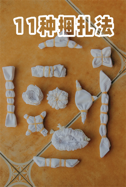 ②絞染:通過紗、線、繩等工具,對織物進(jìn)行扎、縫、縛、夾等多種形式組合后形成自己想要的花色。