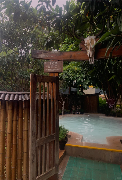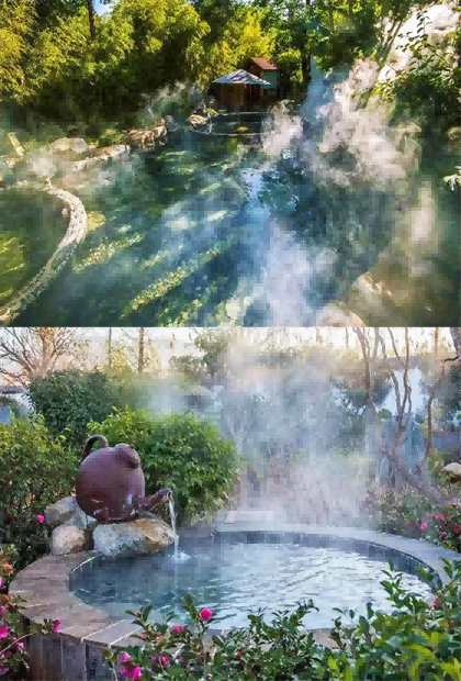 大理地?zé)釃挥诙纯h茈碧湖畔,占地近千畝,且融自然風(fēng)光與名勝古跡為一體,曲徑通幽,小橋流水,一步一景。進(jìn)入大理地?zé)釃瑘@中心有一個大滾鍋,熱氣騰騰,多個形態(tài)各異的露天溫泉池點綴在旁,云蒸霞蔚,盡顯“九氣朝蒸”之奇觀。