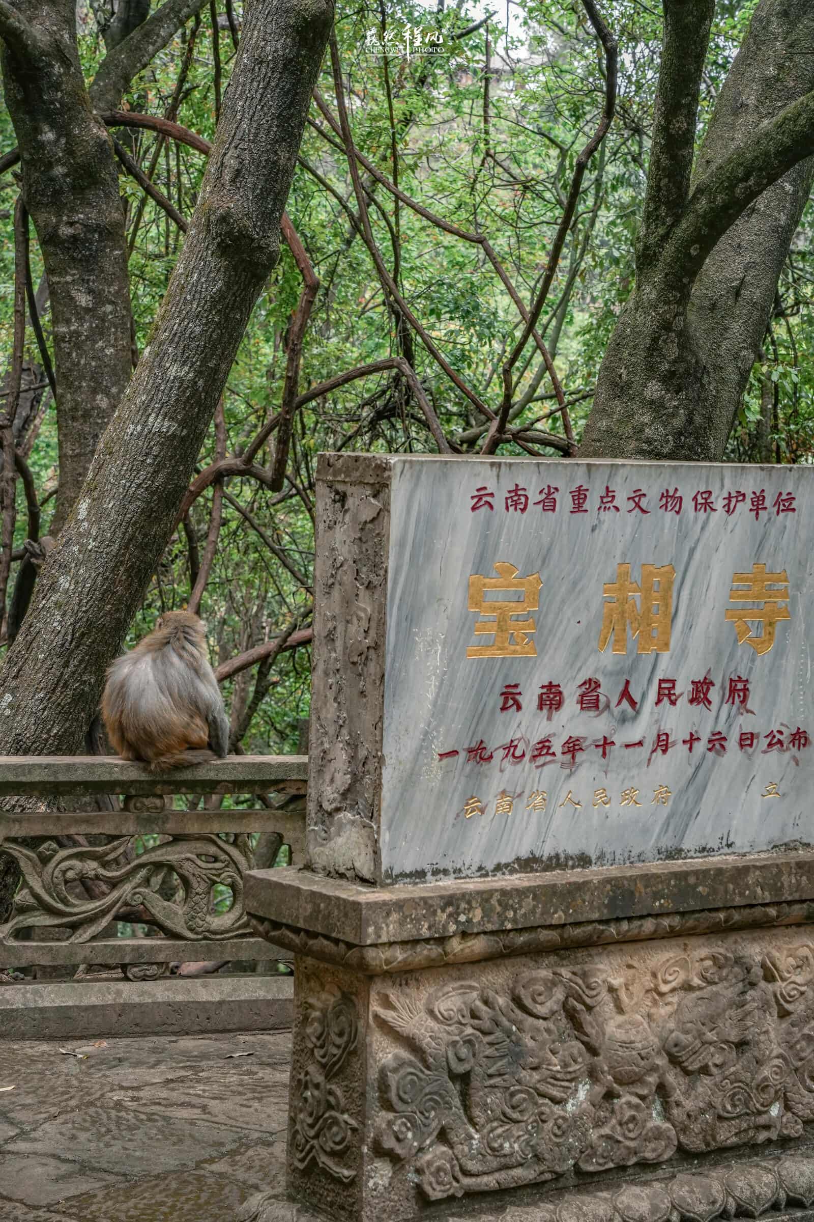 乘坐景區(qū)大巴返程時,會經(jīng)過寶相寺停車點。寶相寺,位于佛頂山上,依山建筑在一堵高聳險峻的大石崖上,下層是大殿,二殿為寺觀,鑿石抬梁,被譽為“云南的懸空寺”始建于元代,最初為道教玉皇閣,后融佛教密宗殿堂,形成"崖窟藏佛閣,云霧繞道觀"的奇觀。從下車點到寶相寺山門,需徒步約15分鐘的臺階,路上能遇見許多野生靈猴守護山門,活脫脫武俠片中的隱世門派。
