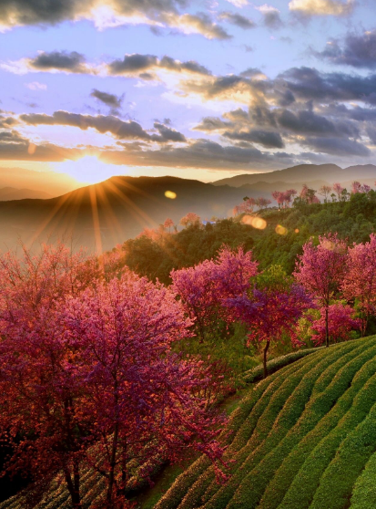 深深淺淺的粉色點(diǎn)綴著茶園襯托著道路行走在花海之中猶如在畫(huà)中暢游每一次漫步便是一場(chǎng)美麗的邂逅