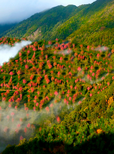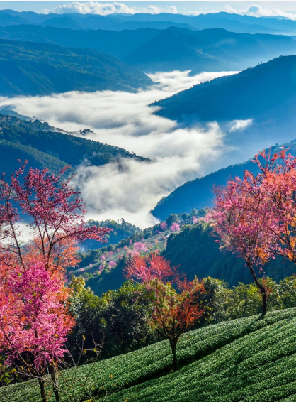茶園里的冬櫻沿著茶山的紋理種植疏密有致冬櫻花綴滿枝頭一簇簇、一叢叢遠(yuǎn)遠(yuǎn)望去如煙如霞與蔚藍(lán)的天空交相輝映