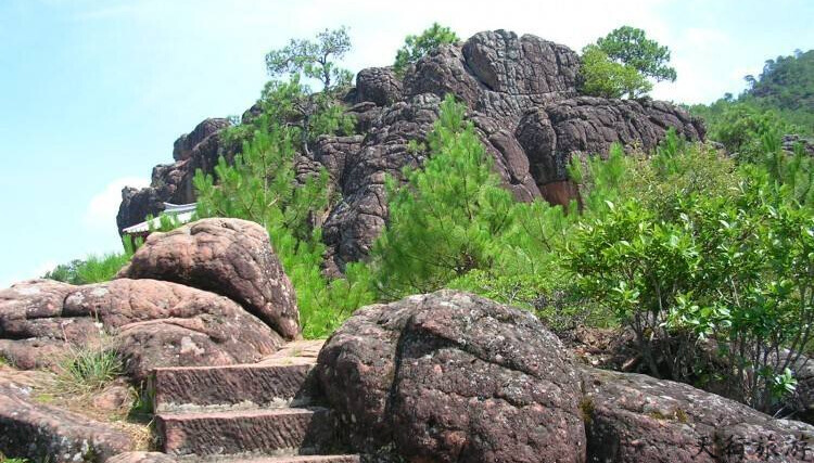 石寶山,白族語稱為“走奔善”,意即“堆滿大石頭的山”,也有學(xué)者解釋為“詔北之山”?!笆瘜殹币幻钤缫娪诿骶疤┰辏?450年)沙溪土官百戶楊惠墓碑上,以“石相可寶”而得名?!笆瘜殹碑?dāng)指石寶山上獨具特色的丹霞地貌—龜背石。李元陽《萬歷云南通志》載:“石寶山,在州之西南二十里,有石佛、石棧、石人、石井、石傘、石象、石獅、石鐘、石鼓之異,五色躑躅,被于陵谷,信奇觀也”。