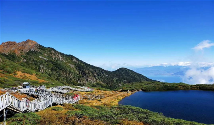 只有洗馬潭附近還盛放著零星的野花,天朗氣清,秋日爽朗就是這幅景象,沒有云霧遮擋的洱海就這么直接出現(xiàn)在眼前,湛藍的洱海與藍天互相輝映,秋意就這么在山巔流轉(zhuǎn),明媚的秋天,山峰都披著絢麗的色彩。