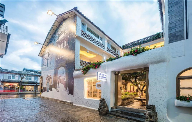 沿著大理古城玉洱路款款前行,在一片青瓦白墻、錯落有致的白族建筑群中,一座小“圣托里尼”——風雪故城藝術(shù)花園客棧脫穎而出。