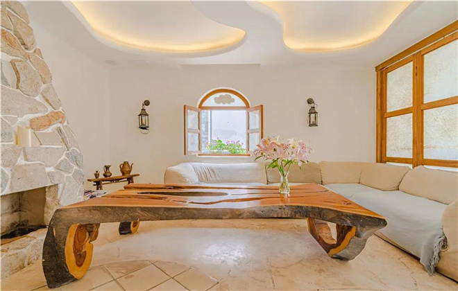 茶室內(nèi),只見左邊墻壁的鏤空洞穴里擺放著許多古玩茶具;靠窗的茶桌旁,布置一個大大的壁爐,風雪交加之際,當壁爐內(nèi)燃起炭火,溫暖從腳邊升騰,直抵心尖。