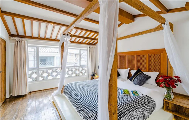 名為“南詔樂韻”的房間內(nèi),床頭擺放著一架歷史已久的古箏,桌上是一個大大的手鼓。尋一個秋冬的溫暖下午,隨意坐在榻榻米上,窗外金黃的銀杏葉伴著古樂聲輕舞飛揚,心中的萬千愁緒隨之化為青煙。