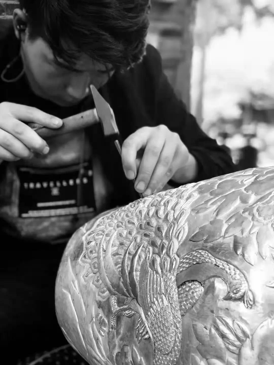 悠悠時(shí)光里,“鶴川匠人們”優(yōu)雅質(zhì)樸,在銀都水鄉(xiāng)這塊絕版寶地上,像潑墨山水畫般寧靜悠遠(yuǎn),真正過著“李子柒式”的生活,一把小錘一敲便是千年。