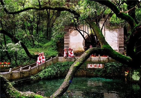 蝴蝶泉的下方是“五龍池”。五龍池的水,被視作忠貞愛(ài)情的象征;在“五龍吐水”的龍頭下洗手,可把幸福、吉祥帶回家。
