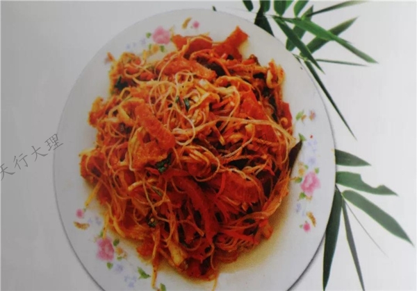 肝生用新鮮的豬肝、豬脾臟、豬皮經(jīng)過煮熟,涼后切成細(xì)絲狀,再放進(jìn)熱油里炸至表皮金黃,將豬小里脊肉用勺子刮成肉末,加入適量食鹽、辣椒粉、食醋扮勻,再與豬肝、豬脾臟、豬皮混合,把它們和發(fā)好的粉絲,以及切成絲的新鮮卷心白、大白菜、胡蘿卜一起加入蔥、姜、芫荽、蒜泥等各種配料,放入適量的食醋、醬油、鹽巴、草果粉、花椒粉、油辣子等調(diào)料充分?jǐn)嚢?,其色紅黃白綠青橙紫,其味酸辣可口,鮮味十足,扎實(shí)誘人,讓你忍不住大塊朵頤。