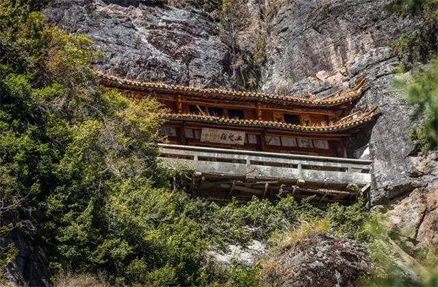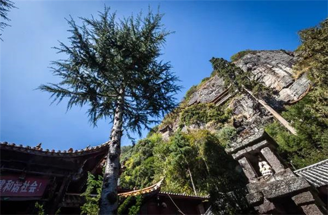 這里有千年古剎賢林禪寺寺后懸掛在峭壁半空的亭臺樓閣是滿賢林最為奇絕壯觀的古建筑群石壁上有一棵巨柏拔地沖天“擎天”是對這棵“倚天”沖霄柏的絕妙寫照