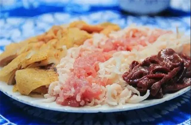 生皮是白族的一道傳統(tǒng)美食,每逢殺豬宴客,這道菜必不可多少。口感最佳的是稻草火燒豬,豬皮金黃,肉質(zhì)細(xì)嫩,再配上一碟秘制蘸水,滿口溢香。
