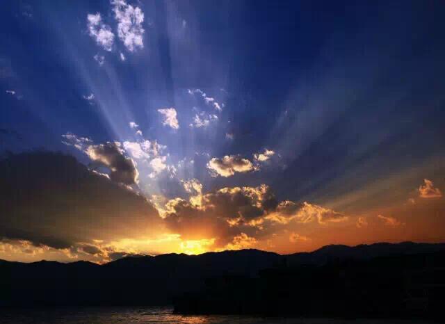 坐在太陽(yáng)傘下,等日落。洱海這邊能經(jīng)常看到丁達(dá)爾效應(yīng),就是俗稱(chēng)的手電筒光??匆?jiàn)光柱從云層打下來(lái),仿佛有雙上帝之手在后面操控。大自然之美,不是不讓人敬畏的。