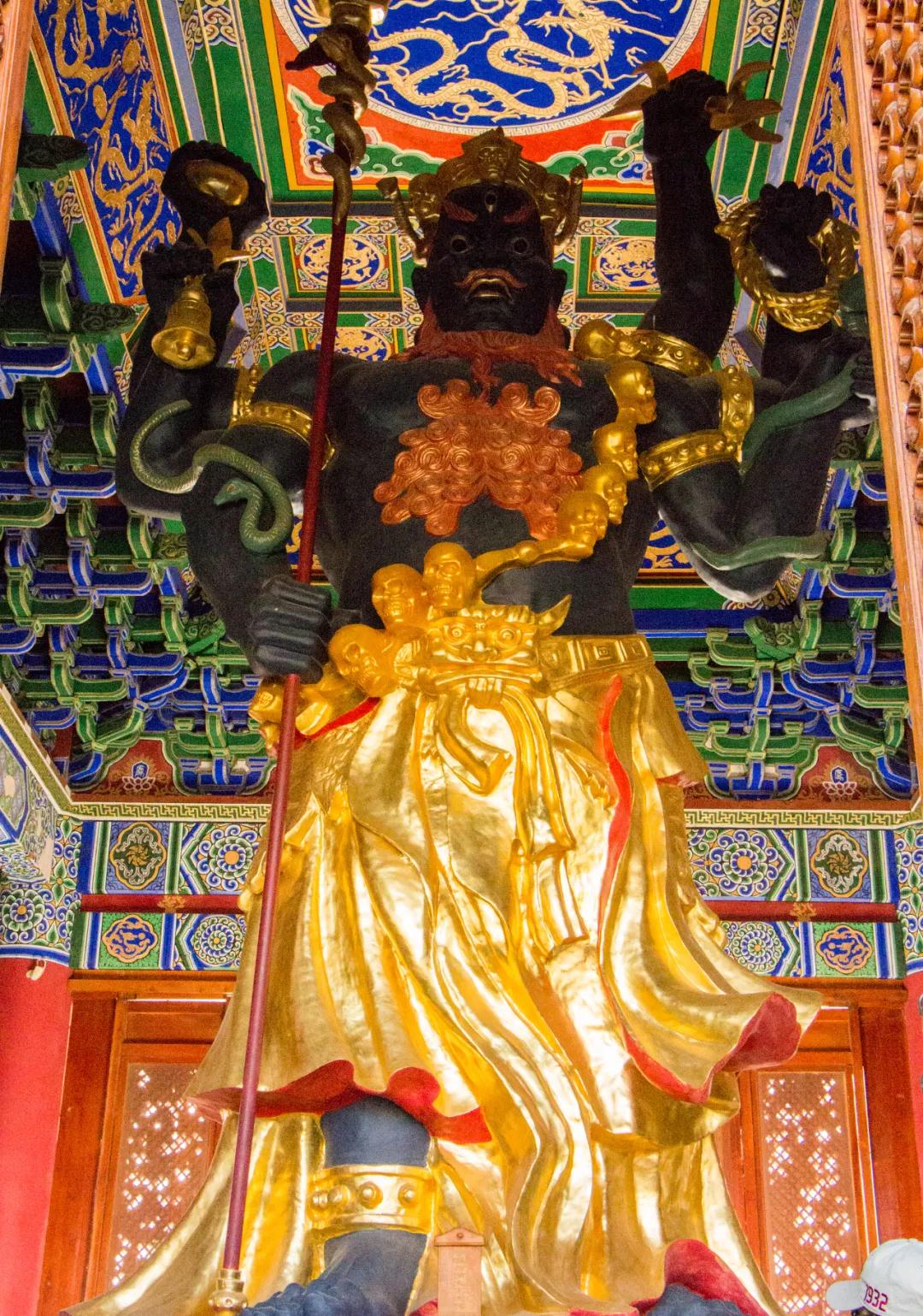 大黑天神是白族神話中舍己為民的天神。相傳,大黑天神原本不是這樣的面貌,他長(zhǎng)相英俊,可是為了拯救大理的蒼生,把即將散布到大理的瘟疫吞下,因此全身發(fā)黑。大理人為了感謝他,將他奉為白族的“本主”,并把他的塑像放置在崇圣寺中,世代供奉。