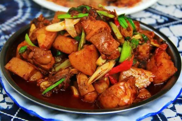 在當(dāng)?shù)卮髲N看來(lái),做黃燜雞沒(méi)有什么訣竅,只需要兩個(gè)字:用心。雞選用永平當(dāng)?shù)氐牟┠仙酵岭u,堅(jiān)持活雞現(xiàn)宰,剁成 2 厘米大小的方塊;然后將干辣椒去把、除籽,切成長(zhǎng)節(jié);注入鍋內(nèi)的香油量要適中,將油燒熱,把花椒、姜、干辣椒放入鍋中炸成亮色,投入仔雞塊,加入適量的醬油、蔥、蒜等,翻炒幾下,蓋上鍋蓋,然后等待雞肉水分干而發(fā)黃,再放入自己調(diào)配好的佐料、蒜末和辣椒翻炒,最后加入適量大蔥便可起鍋;炒燜雞塊一定要掌握火候,只有用旺火炒后燜出來(lái)的才不會(huì)失去真味。
