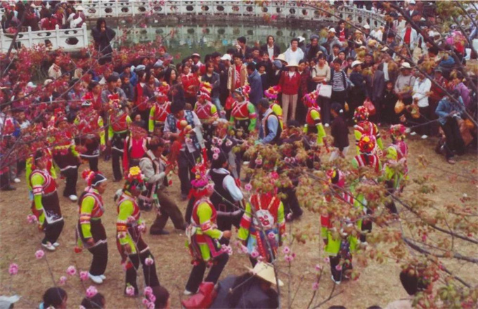 除了濃郁的宗教風(fēng)格造就了“巍寶仙蹤”之外,山中的奇景還形成了有名的巍山八大勝景:拱城遠(yuǎn)眺、天門鎖勝、美女瞻云、龍池秋月、山茶流紅、鶴樓古梅、朝陽育鶴、古洞長春。有關(guān)勝景,這里還有一個神話故事,相傳,八仙之一的何仙姑路過此地時,恰逢彩云顯現(xiàn),美麗的云景使她芳心大動,便不禁臥下仰望云景。后來,在何仙姑躺過的地方長出了三座呈“美女仰臥”形狀的山峰,仙姑不慎失落的珍珠則化作了中央的水池,形成了“美女瞻云”的絕景。巍寶山還是彝族民俗活動的重要場所,每年農(nóng)歷二月十三日至十五日的巍寶山歌會便聚集于此,成為附近彝族青年男女的狂歡節(jié)。