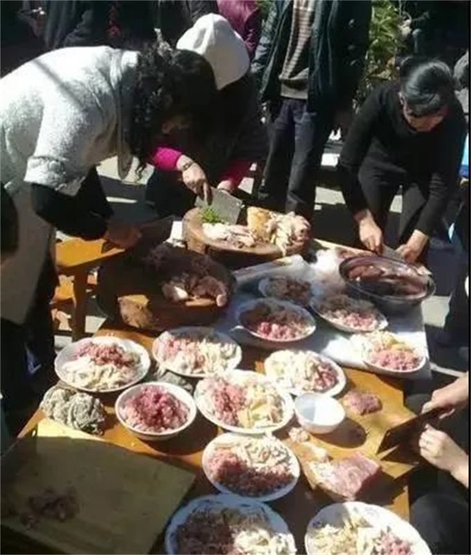 一頭豬被殺翻了,先用稻草點(diǎn)火,將其全身的皮子燒透,去毛,刮洗干凈。用稻草燒烤過(guò)后,整頭豬呈金黃色,皮子及其以下兩三寸的部位,實(shí)際上已經(jīng)被稻草烤熟了。然后開(kāi)肚解剖,趁新鮮將火燒豬肉的“不見(jiàn)天部分(肚底肉、后腿肉)”、豬嘴、豬肝分切成薄片或絲狀食用。